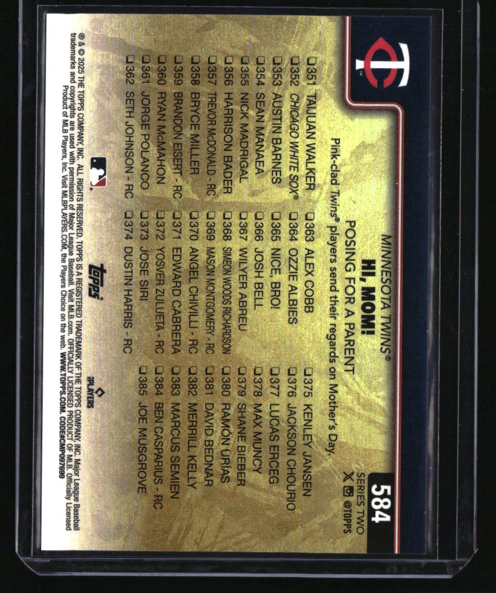 | *This is a Single Trading Card* | *Discounts are not available on Single Trading Cards* | This is a nice example of a 2025 Topps #584 Hi, Mom! Posing for a Parent Golden Mirror . Please check out our other listings for more great cards. Thank you for your interest in one of our cards!!! Prior to making any bids/purchases, I would kindly ask you to read the information below: Item Condition Please see the provided pictures for the condition of the card or item, pictures of the front and back are provided for your review. We cannot accommodate requests for additional pictures. Any notable flaws or damage to this item will be noted in this listing. Please use the attached photos provided for your own assessment. Graded card cases may come with some minor wear/tear, surface scratch, chipped, or blemish. There are no partial refunds or returns because of the case condition. All single cards will come in protective cases. If you purchase a listing that's sold as a lot it may come in snap cases or sealed in a team bag, and not all cards will be individually sleeved and top loaded in all lots. Raw cards are sold as such, with no guarantees of potential and/or expected grades. All cards are sold as is, with no returns or refunds. Listed With Mascot.