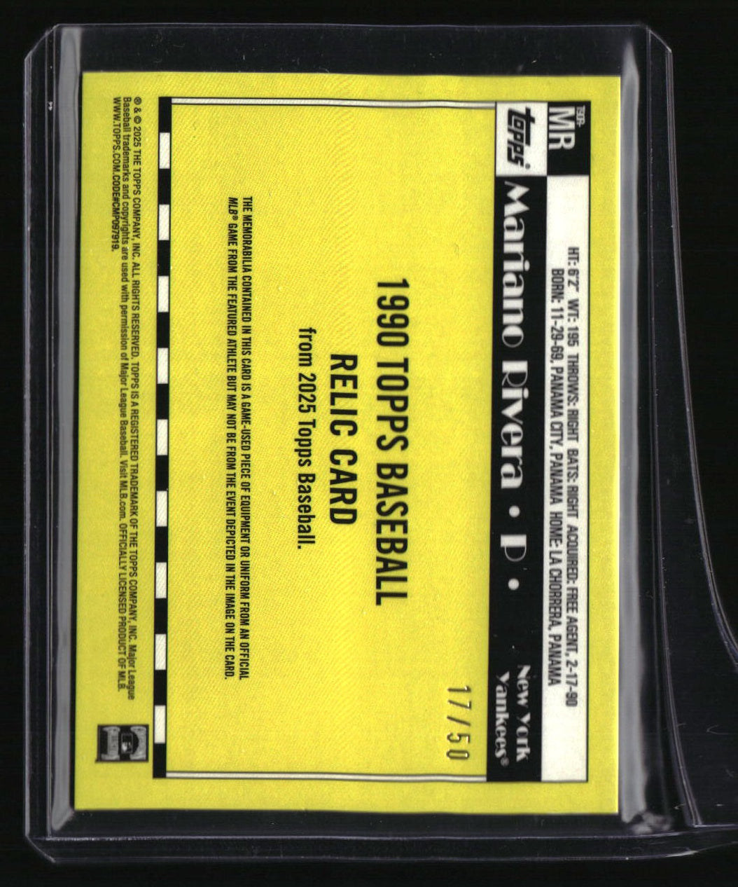 | *This is a Single Trading Card* | *Discounts are not available on Single Trading Cards* | This is a nice example of a 2025 Topps #T90R-MR Mariano Rivera 1990 Topps Baseball 35th Anniversary Relics Gold (Series One) SN,MEM. Please check out our other listings for more great cards. Thank you for your interest in one of our cards!!! Prior to making any bids/purchases, I would kindly ask you to read the information below: Item Condition Please see the provided pictures for the condition of the card or item, pictures of the front and back are provided for your review. We cannot accommodate requests for additional pictures. Any notable flaws or damage to this item will be noted in this listing. Please use the attached photos provided for your own assessment. Graded card cases may come with some minor wear/tear, surface scratch, chipped, or blemish. There are no partial refunds or returns because of the case condition. All single cards will come in protective cases. If you purchase a listing that's sold as a lot it may come in snap cases or sealed in a team bag, and not all cards will be individually sleeved and top loaded in all lots. Raw cards are sold as such, with no guarantees of potential and/or expected grades. All cards are sold as is, with no returns or refunds. Listed With Mascot.