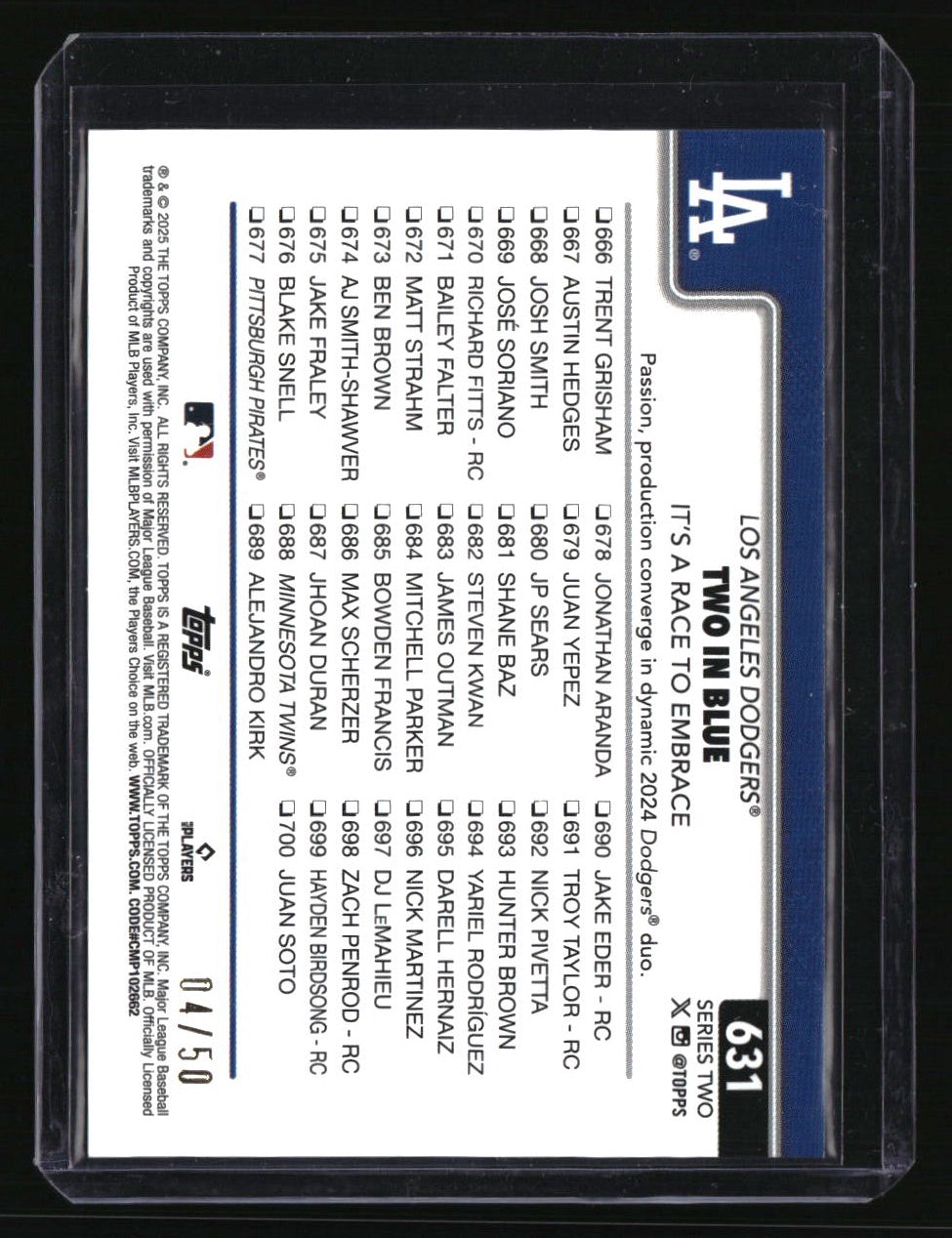 | *This is a Single Trading Card* | *Discounts are not available on Single Trading Cards* | This is a nice example of a 2025 Topps #631 Two in Blue: It’s a Race to Embrace Gold Holo Foil SN. Please check out our other listings for more great cards. Thank you for your interest in one of our cards!!! Prior to making any bids/purchases, I would kindly ask you to read the information below: Item Condition Please see the provided pictures for the condition of the card or item, pictures of the front and back are provided for your review. We cannot accommodate requests for additional pictures. Any notable flaws or damage to this item will be noted in this listing. Please use the attached photos provided for your own assessment. Graded card cases may come with some minor wear/tear, surface scratch, chipped, or blemish. There are no partial refunds or returns because of the case condition. All single cards will come in protective cases. If you purchase a listing that's sold as a lot it may come in snap cases or sealed in a team bag, and not all cards will be individually sleeved and top loaded in all lots. Raw cards are sold as such, with no guarantees of potential and/or expected grades. All cards are sold as is, with no returns or refunds. Listed With Mascot.