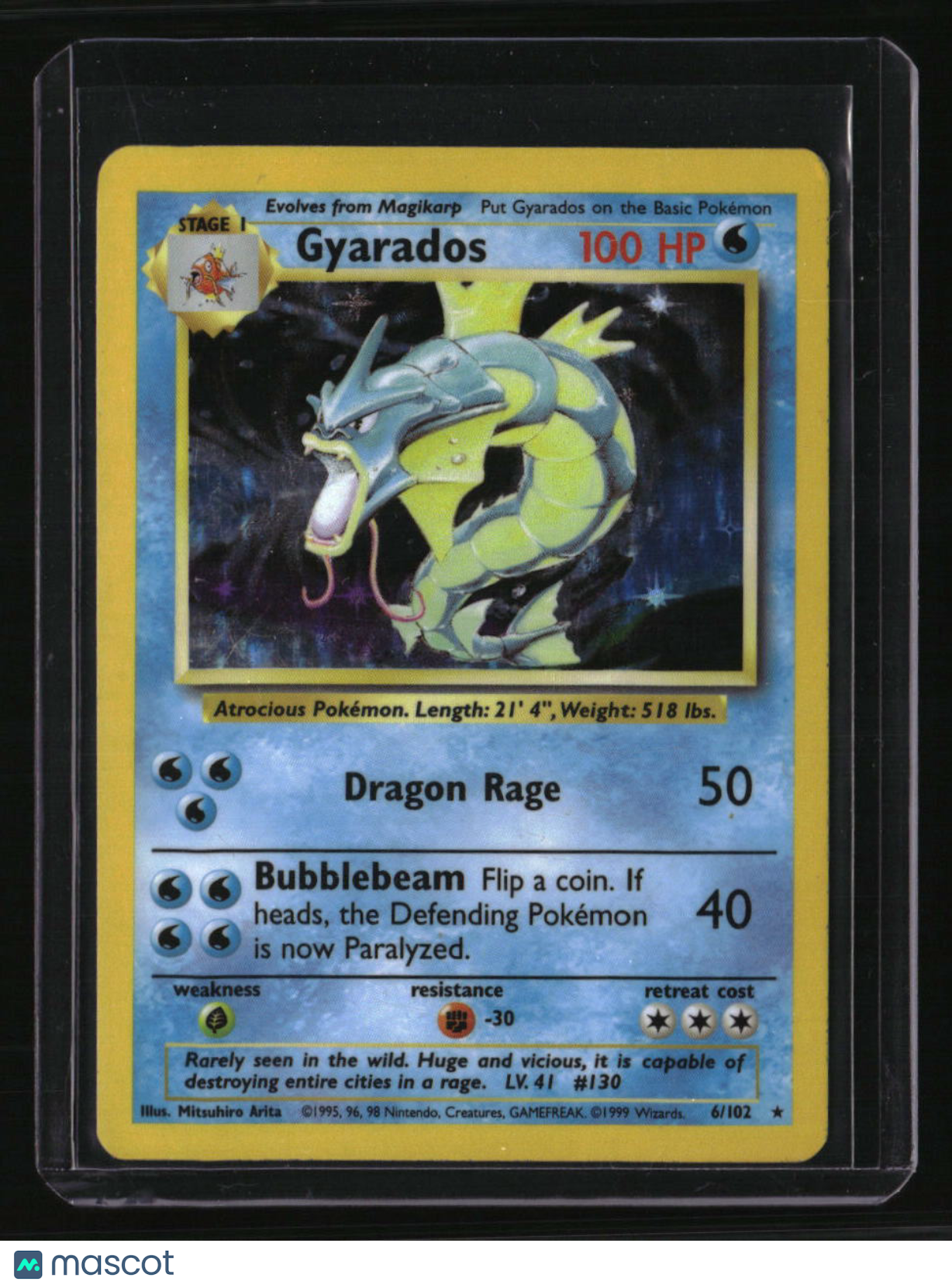 | *This is a Single Trading Card* | *Discounts are not available on Single Trading Cards* | This is a nice example of a Base Set #006/102 Gyarados Holo Rare. Please check out our other listings for more great cards. Thank you for your interest in one of our cards!!! Prior to making any bids/purchases, I would kindly ask you to read the information below: Item Condition Please see the provided pictures for the condition of the card or item, pictures of the front and back are provided for your review. We cannot accommodate requests for additional pictures. Any notable flaws or damage to this item will be noted in this listing. Please use the attached photos provided for your own assessment. Graded card cases may come with some minor wear/tear, surface scratch, chipped, or blemish. There are no partial refunds or returns because of the case condition. All single cards will come in protective cases. If you purchase a listing that's sold as a lot it may come in snap cases or sealed in a team bag, and not all cards will be individually sleeved and top loaded in all lots. Raw cards are sold as such, with no guarantees of potential and/or expected grades. All cards are sold as is, with no returns or refunds. Listed With Mascot.