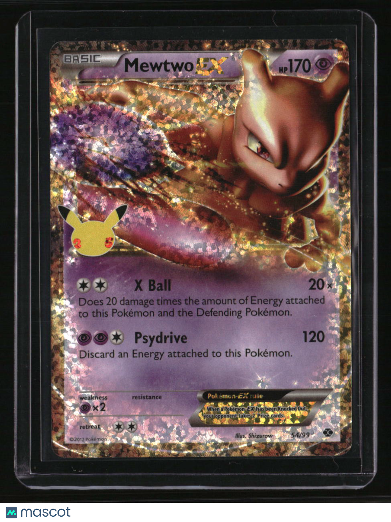 | *This is a Single Trading Card* | *Discounts are not available on Single Trading Cards* | This is a nice example of a Celebrations: Classic Collection #54/99 Mewtwo EX Classic Collection,Holo. Please check out our other listings for more great cards. Thank you for your interest in one of our cards!!! Prior to making any bids/purchases, I would kindly ask you to read the information below: Item Condition Please see the provided pictures for the condition of the card or item, pictures of the front and back are provided for your review. We cannot accommodate requests for additional pictures. Any notable flaws or damage to this item will be noted in this listing. Please use the attached photos provided for your own assessment. Graded card cases may come with some minor wear/tear, surface scratch, chipped, or blemish. There are no partial refunds or returns because of the case condition. All single cards will come in protective cases. If you purchase a listing that's sold as a lot it may come in snap cases or sealed in a team bag, and not all cards will be individually sleeved and top loaded in all lots. Raw cards are sold as such, with no guarantees of potential and/or expected grades. All cards are sold as is, with no returns or refunds. Listed With Mascot.
