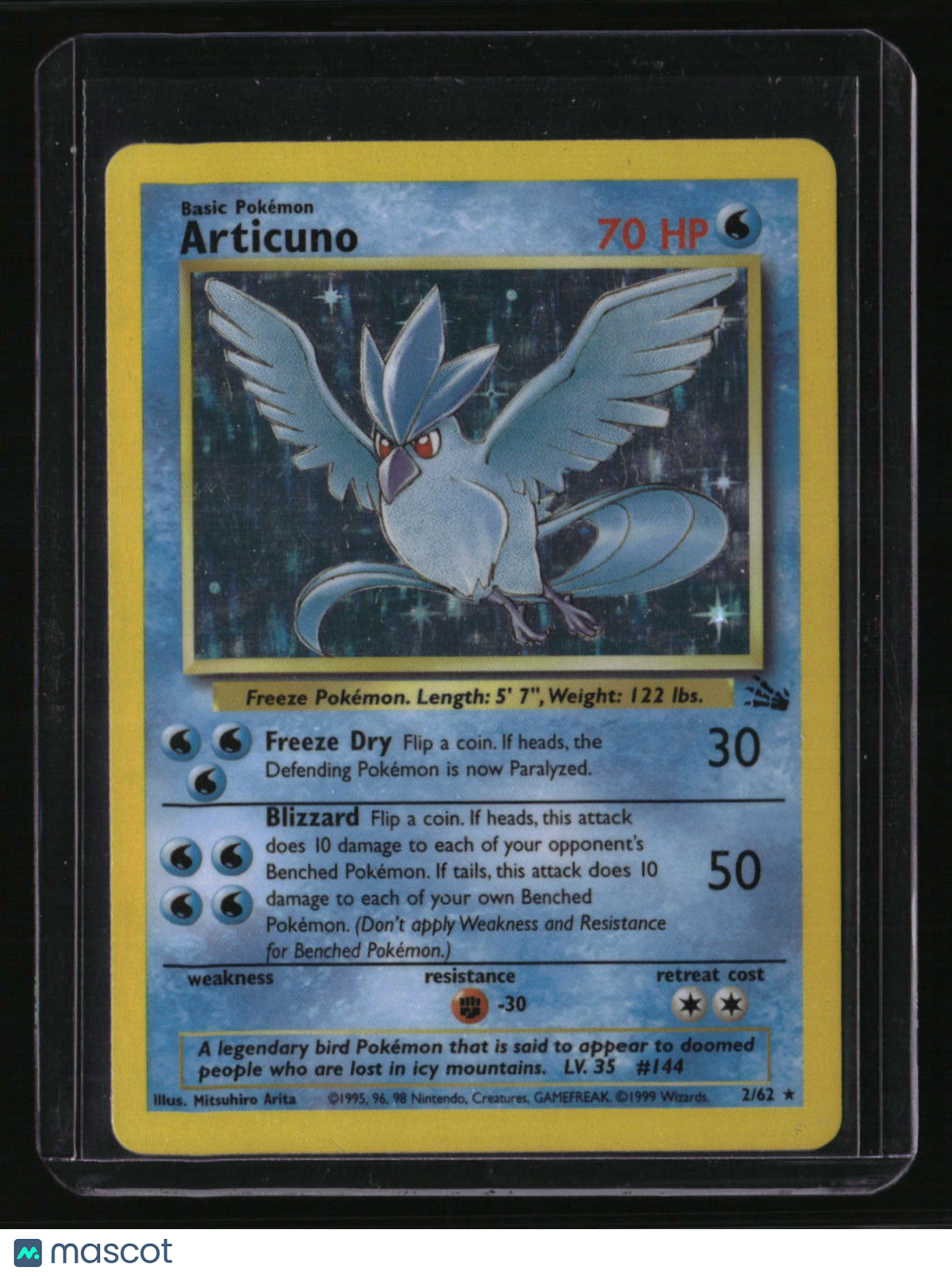 | *This is a Single Trading Card* | *Discounts are not available on Single Trading Cards* | This is a nice example of a Fossil #02/62 Articuno (2) Holo Rare. Please check out our other listings for more great cards. Thank you for your interest in one of our cards!!! Prior to making any bids/purchases, I would kindly ask you to read the information below: Item Condition Please see the provided pictures for the condition of the card or item, pictures of the front and back are provided for your review. We cannot accommodate requests for additional pictures. Any notable flaws or damage to this item will be noted in this listing. Please use the attached photos provided for your own assessment. Graded card cases may come with some minor wear/tear, surface scratch, chipped, or blemish. There are no partial refunds or returns because of the case condition. All single cards will come in protective cases. If you purchase a listing that's sold as a lot it may come in snap cases or sealed in a team bag, and not all cards will be individually sleeved and top loaded in all lots. Raw cards are sold as such, with no guarantees of potential and/or expected grades. All cards are sold as is, with no returns or refunds. Listed With Mascot.