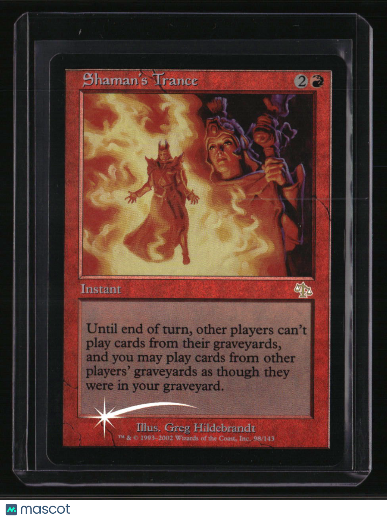 | *This is a Single Trading Card* | *Discounts are not available on Single Trading Cards* | This is a nice example of a Judgment #98 Shaman's Trance Rare. Please check out our other listings for more great cards. Thank you for your interest in one of our cards!!! Prior to making any bids/purchases, I would kindly ask you to read the information below: Item Condition Please see the provided pictures for the condition of the card or item, pictures of the front and back are provided for your review. We cannot accommodate requests for additional pictures. Any notable flaws or damage to this item will be noted in this listing. Please use the attached photos provided for your own assessment. Graded card cases may come with some minor wear/tear, surface scratch, chipped, or blemish. There are no partial refunds or returns because of the case condition. All single cards will come in protective cases. If you purchase a listing that's sold as a lot it may come in snap cases or sealed in a team bag, and not all cards will be individually sleeved and top loaded in all lots. Raw cards are sold as such, with no guarantees of potential and/or expected grades. All cards are sold as is, with no returns or refunds. Listed With Mascot.
