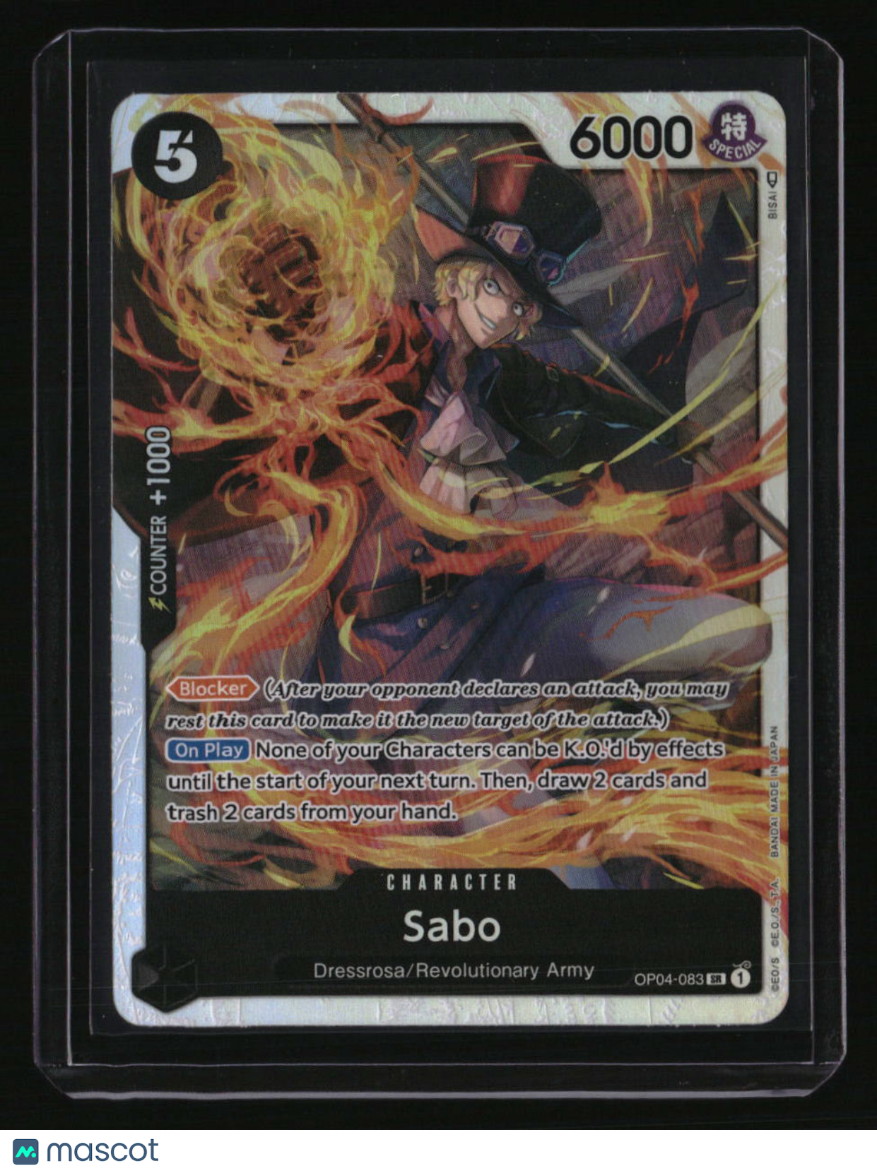 | *This is a Single Trading Card* | *Discounts are not available on Single Trading Cards* | This is a nice example of a Kingdoms of Intrigue #OP04-083 Sabo Super Rare. Please check out our other listings for more great cards. Thank you for your interest in one of our cards!!! Prior to making any bids/purchases, I would kindly ask you to read the information below: Item Condition Please see the provided pictures for the condition of the card or item, pictures of the front and back are provided for your review. We cannot accommodate requests for additional pictures. Any notable flaws or damage to this item will be noted in this listing. Please use the attached photos provided for your own assessment. Graded card cases may come with some minor wear/tear, surface scratch, chipped, or blemish. There are no partial refunds or returns because of the case condition. All single cards will come in protective cases. If you purchase a listing that's sold as a lot it may come in snap cases or sealed in a team bag, and not all cards will be individually sleeved and top loaded in all lots. Raw cards are sold as such, with no guarantees of potential and/or expected grades. All cards are sold as is, with no returns or refunds. Listed With Mascot.
