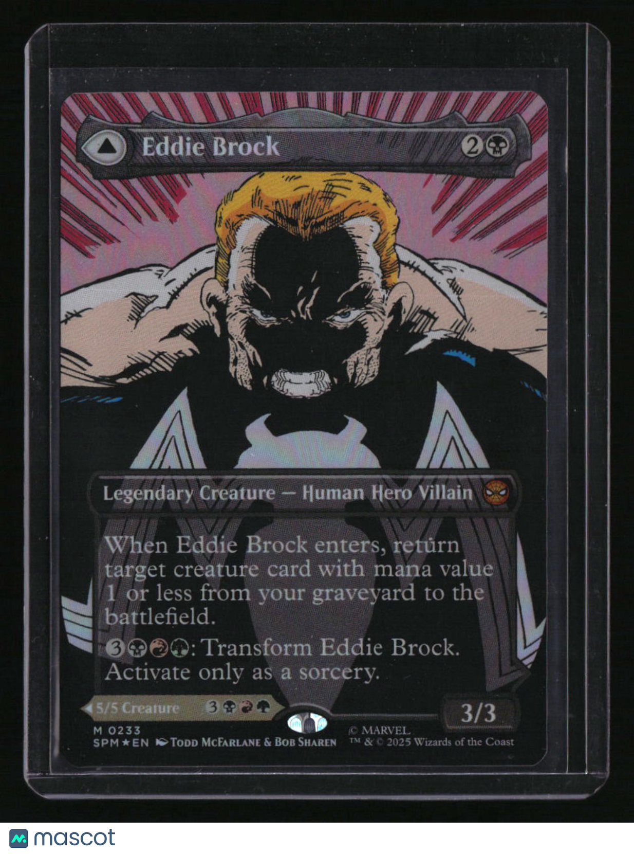 | *This is a Single Trading Card* | *Discounts are not available on Single Trading Cards* | This is a nice example of a Marvel's Spider-Man #233 Eddie Brock (0233) (Borderless) Mythic. Please check out our other listings for more great cards. Thank you for your interest in one of our cards!!! Prior to making any bids/purchases, I would kindly ask you to read the information below: Item Condition Please see the provided pictures for the condition of the card or item, pictures of the front and back are provided for your review. We cannot accommodate requests for additional pictures. Any notable flaws or damage to this item will be noted in this listing. Please use the attached photos provided for your own assessment. Graded card cases may come with some minor wear/tear, surface scratch, chipped, or blemish. There are no partial refunds or returns because of the case condition. All single cards will come in protective cases. If you purchase a listing that's sold as a lot it may come in snap cases or sealed in a team bag, and not all cards will be individually sleeved and top loaded in all lots. Raw cards are sold as such, with no guarantees of potential and/or expected grades. All cards are sold as is, with no returns or refunds. Listed With Mascot.