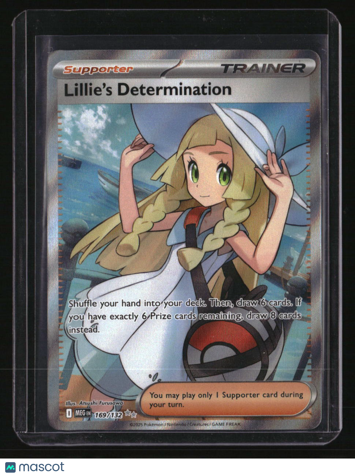 | *This is a Single Trading Card* | *Discounts are not available on Single Trading Cards* | This is a nice example of a ME01: Mega Evolution #169/132 Lillie's Determination Ultra Rare,Holo. Please check out our other listings for more great cards. Thank you for your interest in one of our cards!!! Prior to making any bids/purchases, I would kindly ask you to read the information below: Item Condition Please see the provided pictures for the condition of the card or item, pictures of the front and back are provided for your review. We cannot accommodate requests for additional pictures. Any notable flaws or damage to this item will be noted in this listing. Please use the attached photos provided for your own assessment. Graded card cases may come with some minor wear/tear, surface scratch, chipped, or blemish. There are no partial refunds or returns because of the case condition. All single cards will come in protective cases. If you purchase a listing that's sold as a lot it may come in snap cases or sealed in a team bag, and not all cards will be individually sleeved and top loaded in all lots. Raw cards are sold as such, with no guarantees of potential and/or expected grades. All cards are sold as is, with no returns or refunds.