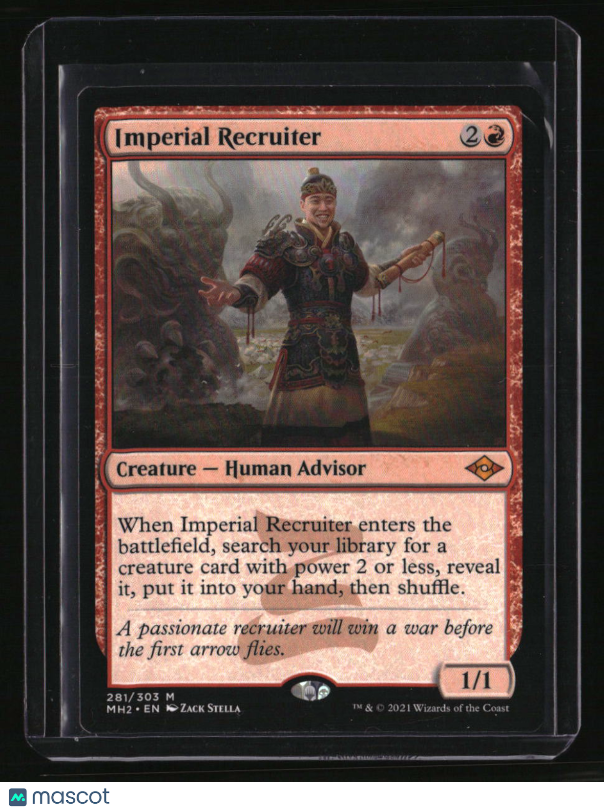 | *This is a Single Trading Card* | *Discounts are not available on Single Trading Cards* | This is a nice example of a Modern Horizons 2 #281 Imperial Recruiter Mythic. Please check out our other listings for more great cards. Thank you for your interest in one of our cards!!! Prior to making any bids/purchases, I would kindly ask you to read the information below: Item Condition Please see the provided pictures for the condition of the card or item, pictures of the front and back are provided for your review. We cannot accommodate requests for additional pictures. Any notable flaws or damage to this item will be noted in this listing. Please use the attached photos provided for your own assessment. Graded card cases may come with some minor wear/tear, surface scratch, chipped, or blemish. There are no partial refunds or returns because of the case condition. All single cards will come in protective cases. If you purchase a listing that's sold as a lot it may come in snap cases or sealed in a team bag, and not all cards will be individually sleeved and top loaded in all lots. Raw cards are sold as such, with no guarantees of potential and/or expected grades. All cards are sold as is, with no returns or refunds. Listed With Mascot.