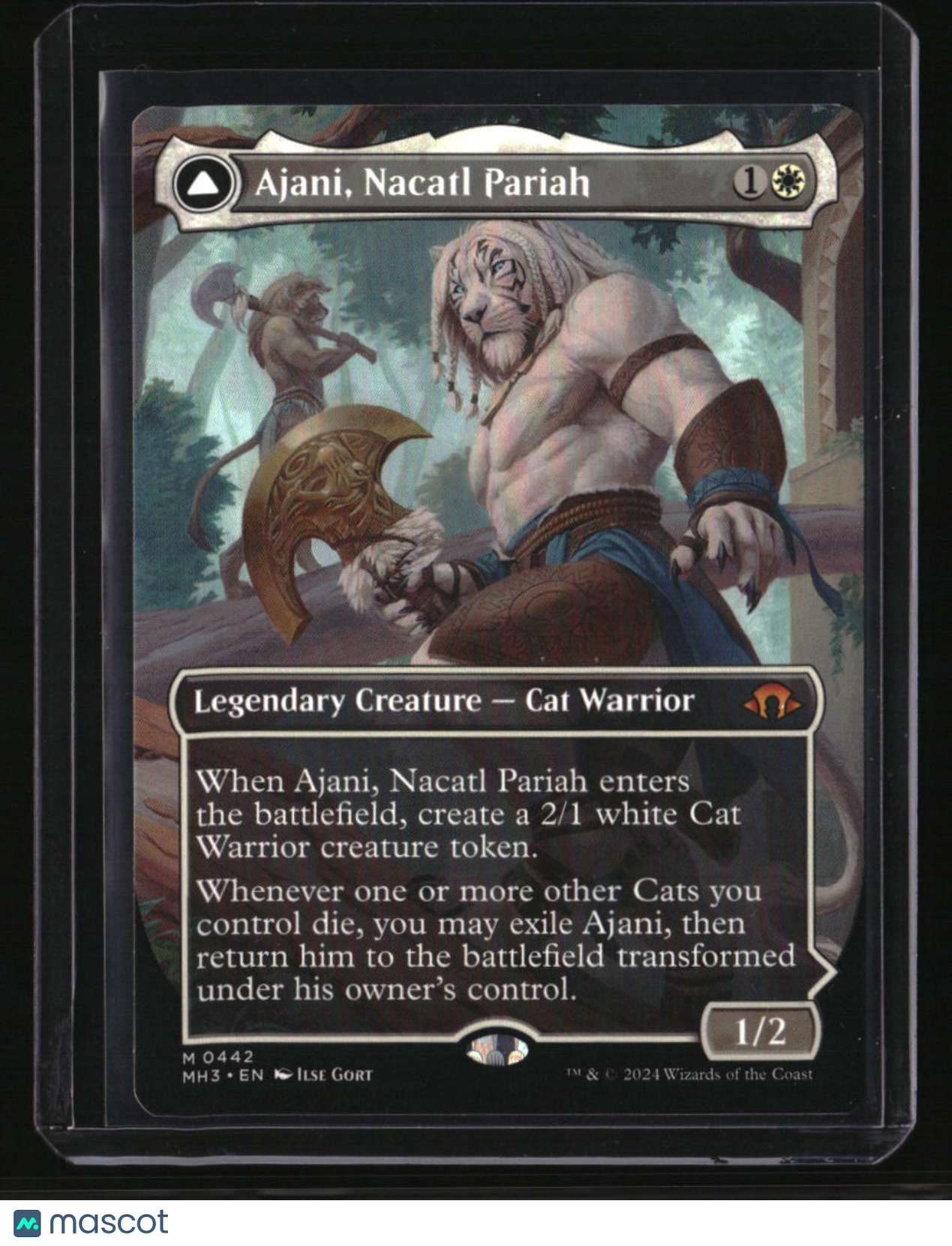 | *This is a Single Trading Card* | *Discounts are not available on Single Trading Cards* | This is a nice example of a Modern Horizons 3 #442 Ajani, Nacatl Pariah (Borderless) Mythic. Please check out our other listings for more great cards. Thank you for your interest in one of our cards!!! Prior to making any bids/purchases, I would kindly ask you to read the information below: Item Condition Please see the provided pictures for the condition of the card or item, pictures of the front and back are provided for your review. We cannot accommodate requests for additional pictures. Any notable flaws or damage to this item will be noted in this listing. Please use the attached photos provided for your own assessment. Graded card cases may come with some minor wear/tear, surface scratch, chipped, or blemish. There are no partial refunds or returns because of the case condition. All single cards will come in protective cases. If you purchase a listing that's sold as a lot it may come in snap cases or sealed in a team bag, and not all cards will be individually sleeved and top loaded in all lots. Raw cards are sold as such, with no guarantees of potential and/or expected grades. All cards are sold as is, with no returns or refunds. Listed With Mascot.
