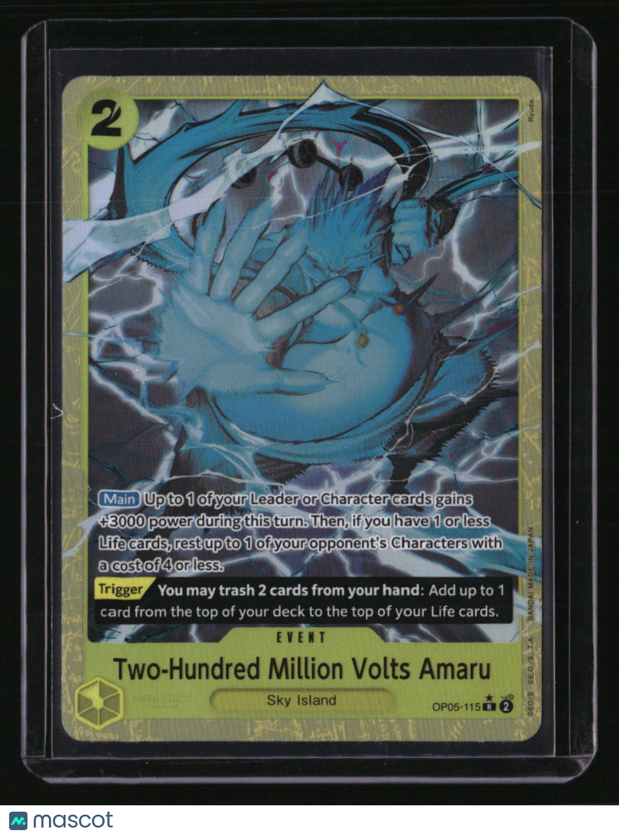 | *This is a Single Trading Card* | *Discounts are not available on Single Trading Cards* | This is a nice example of a Premium Booster -The Best- #OP05-115 Two-Hundred Million Volts Amaru (Alternate Art) Rare. Please check out our other listings for more great cards. Thank you for your interest in one of our cards!!! Prior to making any bids/purchases, I would kindly ask you to read the information below: Item Condition Please see the provided pictures for the condition of the card or item, pictures of the front and back are provided for your review. We cannot accommodate requests for additional pictures. Any notable flaws or damage to this item will be noted in this listing. Please use the attached photos provided for your own assessment. Graded card cases may come with some minor wear/tear, surface scratch, chipped, or blemish. There are no partial refunds or returns because of the case condition. All single cards will come in protective cases. If you purchase a listing that's sold as a lot it may come in snap cases or sealed in a team bag, and not all cards will be individually sleeved and top loaded in all lots. Raw cards are sold as such, with no guarantees of potential and/or expected grades. All cards are sold as is, with no returns or refunds. Listed With Mascot.