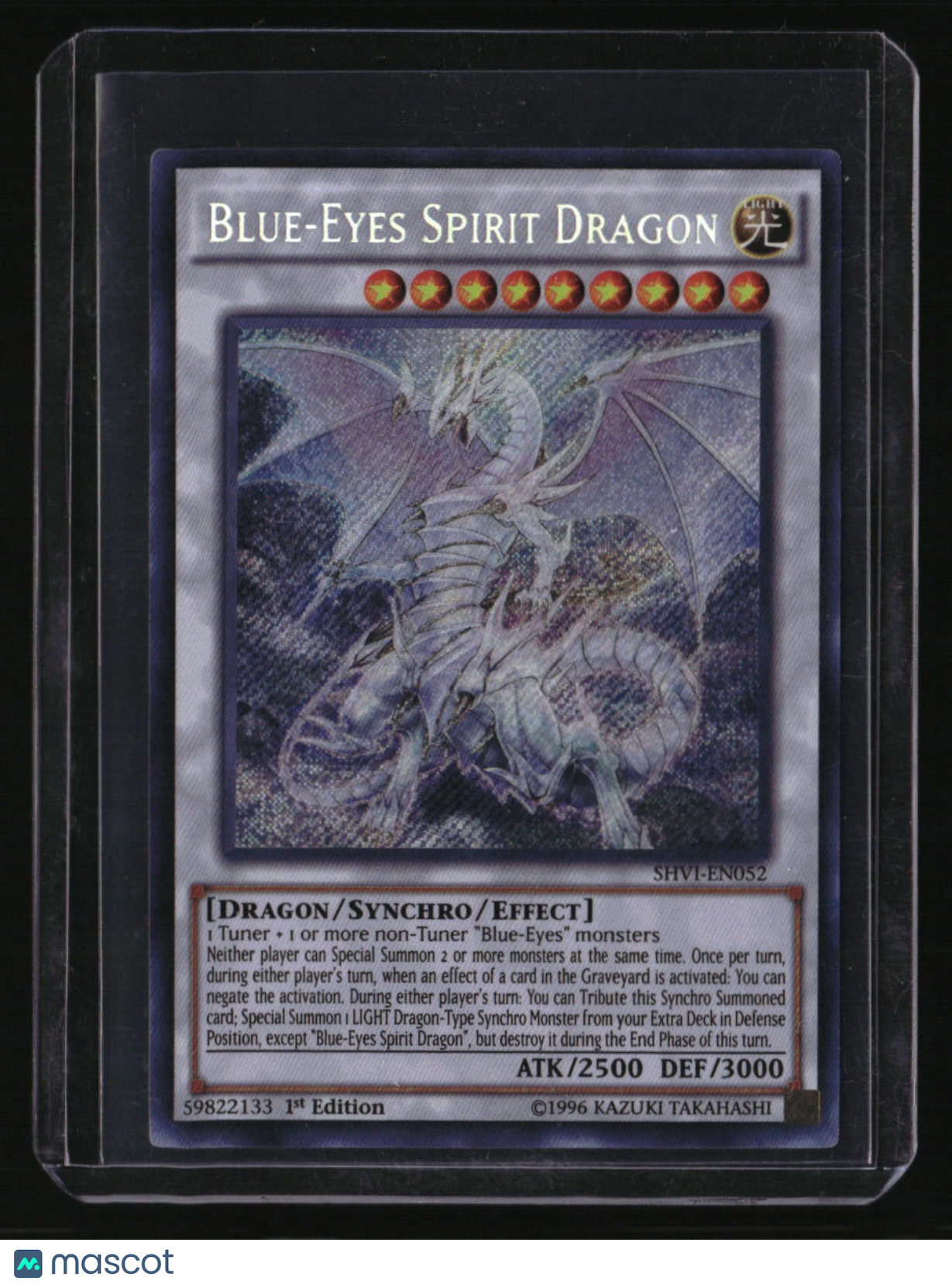 | *This is a Single Trading Card* | *Discounts are not available on Single Trading Cards* | This is a nice example of a Shining Victories #SHVI-EN052 Blue-Eyes Spirit Dragon Secret Rare. Please check out our other listings for more great cards. Thank you for your interest in one of our cards!!! Prior to making any bids/purchases, I would kindly ask you to read the information below: Item Condition Please see the provided pictures for the condition of the card or item, pictures of the front and back are provided for your review. We cannot accommodate requests for additional pictures. Any notable flaws or damage to this item will be noted in this listing. Please use the attached photos provided for your own assessment. Graded card cases may come with some minor wear/tear, surface scratch, chipped, or blemish. There are no partial refunds or returns because of the case condition. All single cards will come in protective cases. If you purchase a listing that's sold as a lot it may come in snap cases or sealed in a team bag, and not all cards will be individually sleeved and top loaded in all lots. Raw cards are sold as such, with no guarantees of potential and/or expected grades. All cards are sold as is, with no returns or refunds. Listed With Mascot.