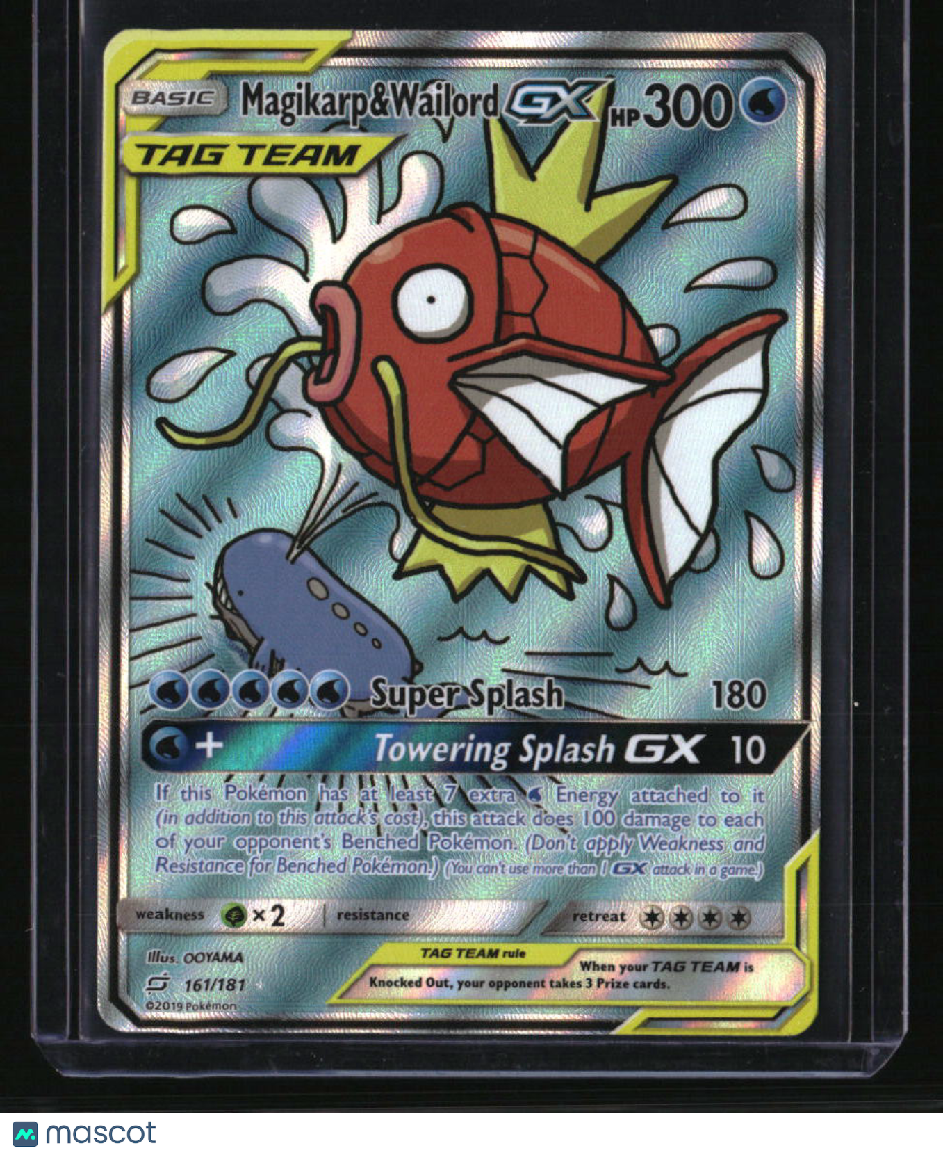 | *This is a Single Trading Card* | *Discounts are not available on Single Trading Cards* | This is a nice example of a SM - Team Up #161/181 Magikarp & Wailord GX (Alternate Full Art) Ultra Rare. Please check out our other listings for more great cards. Thank you for your interest in one of our cards!!! Prior to making any bids/purchases, I would kindly ask you to read the information below: Item Condition Please see the provided pictures for the condition of the card or item, pictures of the front and back are provided for your review. We cannot accommodate requests for additional pictures. Any notable flaws or damage to this item will be noted in this listing. Please use the attached photos provided for your own assessment. Graded card cases may come with some minor wear/tear, surface scratch, chipped, or blemish. There are no partial refunds or returns because of the case condition. All single cards will come in protective cases. If you purchase a listing that's sold as a lot it may come in snap cases or sealed in a team bag, and not all cards will be individually sleeved and top loaded in all lots. Raw cards are sold as such, with no guarantees of potential and/or expected grades. All cards are sold as is, with no returns or refunds. Listed With Mascot.