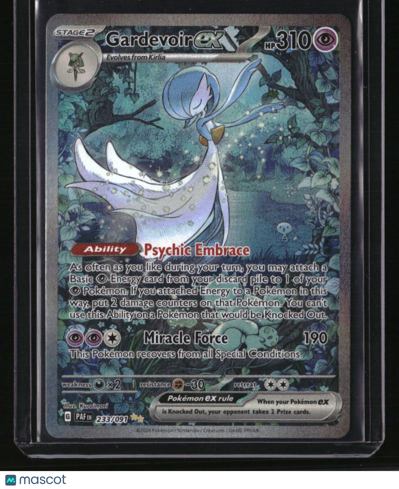 | *This is a Single Trading Card* | *Discounts are not available on Single Trading Cards* | This is a nice example of a SV: Paldean Fates #233/091 Gardevoir ex . Please check out our other listings for more great cards. Thank you for your interest in one of our cards!!! Prior to making any bids/purchases, I would kindly ask you to read the information below: Item Condition Please see the provided pictures for the condition of the card or item, pictures of the front and back are provided for your review. We cannot accommodate requests for additional pictures. Any notable flaws or damage to this item will be noted in this listing. Please use the attached photos provided for your own assessment. Graded card cases may come with some minor wear/tear, surface scratch, chipped, or blemish. There are no partial refunds or returns because of the case condition. All single cards will come in protective cases. If you purchase a listing that's sold as a lot it may come in snap cases or sealed in a team bag, and not all cards will be individually sleeved and top loaded in all lots. Raw cards are sold as such, with no guarantees of potential and/or expected grades. All cards are sold as is, with no returns or refunds. Listed With Mascot.