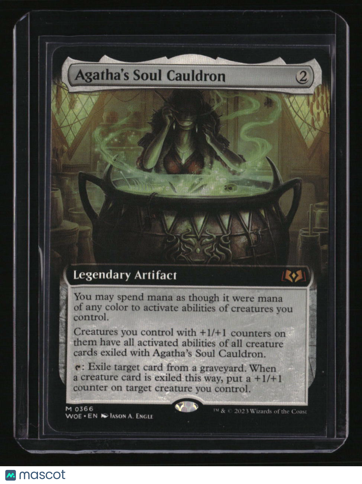 | *This is a Single Trading Card* | *Discounts are not available on Single Trading Cards* | This is a nice example of a Wilds of Eldraine #366 Agatha's Soul Cauldron (Extended Art) Mythic. Please check out our other listings for more great cards. Thank you for your interest in one of our cards!!! Prior to making any bids/purchases, I would kindly ask you to read the information below: Item Condition Please see the provided pictures for the condition of the card or item, pictures of the front and back are provided for your review. We cannot accommodate requests for additional pictures. Any notable flaws or damage to this item will be noted in this listing. Please use the attached photos provided for your own assessment. Graded card cases may come with some minor wear/tear, surface scratch, chipped, or blemish. There are no partial refunds or returns because of the case condition. All single cards will come in protective cases. If you purchase a listing that's sold as a lot it may come in snap cases or sealed in a team bag, and not all cards will be individually sleeved and top loaded in all lots. Raw cards are sold as such, with no guarantees of potential and/or expected grades. All cards are sold as is, with no returns or refunds. Listed With Mascot.